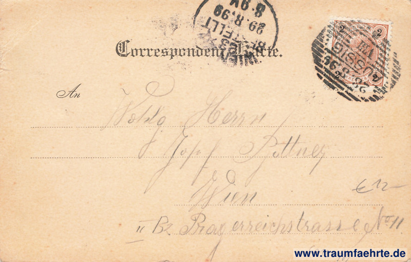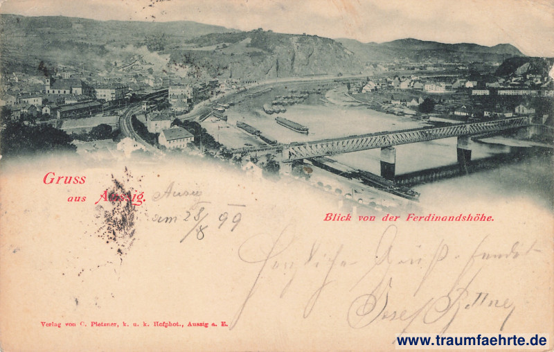 – Details – Year: ca. 1895 Postal state: postally used 1899 Inscription front: Gruss aus Aussig. Blick von der Ferdinandshöhe. Verlag vom C. Pletzner, k. u. k. Hofphot., Aussig a. E. Inscription back: Correspondenz-Karte. An … Postmark(s): Aussig VIII, 28.8.99; Wien […] bestellt, 29.8.99, 8–9V Please note: