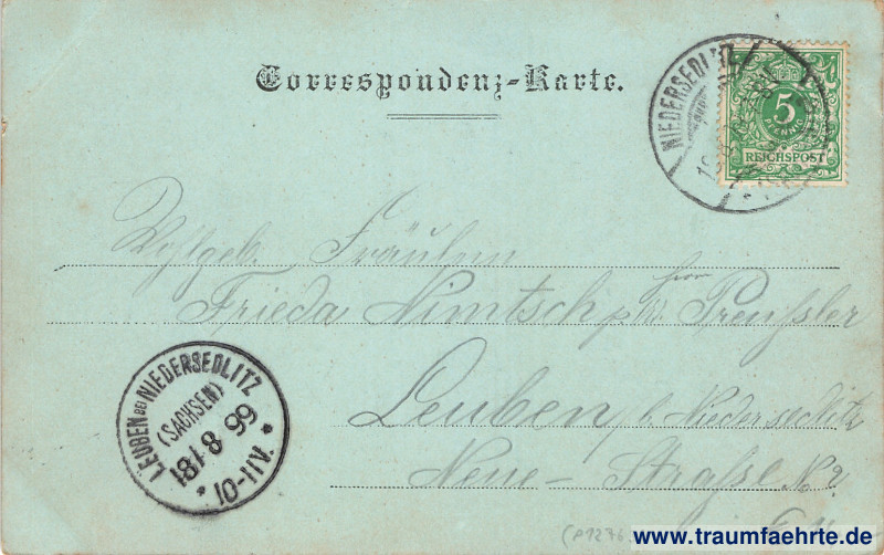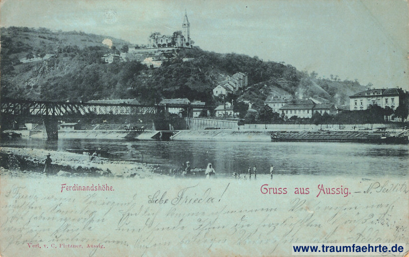 – Details – Year: ca. 1895 Postal state: postally used 1899 Inscription front: Gruss aus Aussig. Ferdinandshöhe. Verl. v. C. Pietzner, Aussig. Inscription back: Correspondenz-Karte. Postmark(s): Niedersedlitz, […], 18.8.99 7–8V.; Leuben bei Niedersedlitz (Sachsen), * *, 18/8 99, 10–11V. Please note: