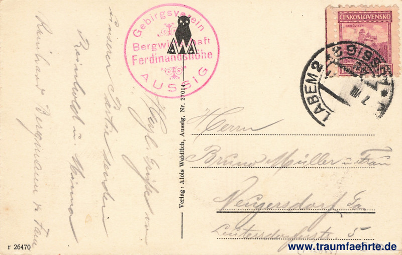 – Details – Year: ca. 1925 Postal state: postally used 19?? Inscription front: Aussig a. d. E. Ferdinandshöhe mit Elbstraße Inscription back: AWA, Verlag: Alois Weidlich, Aussig. Nr. 27014. r 26470 Postmark(s): [Ústí n.] Labem, Aussig 2, 7.VIII.[…]; Gebirgsverein, Bergwirtschaft Ferdinandshöhe, Aussig Please note: