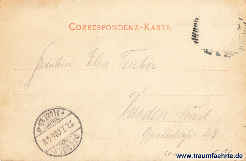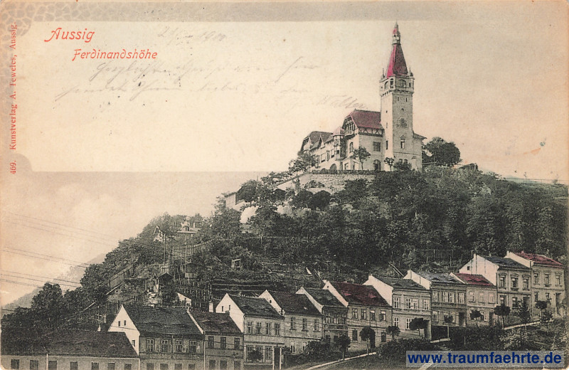 – Details – Jahr: ca. 1895 Status: gelaufen 1900, Briefmarke entfernt Beschriftung vorne: Aussig, Ferdinandshöhe, 469. Kunstverlag A. Teweles, Aussig. Beschriftung hinten: Correspondenz-Karte. Stempel: […]; Dresden-Neust. 15, * [b], 23.7.00 5–6V. Hinweis: