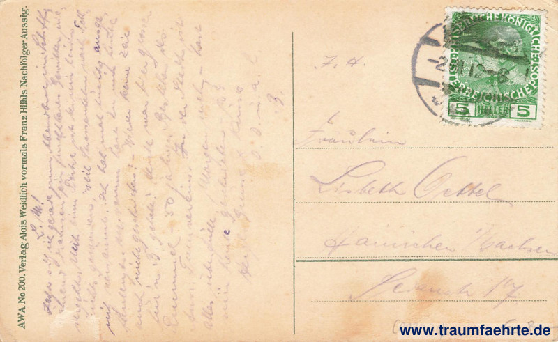 – Details – Jahr: ca. 1910 Status: gelaufen 1912 Beschriftung vorne: Aussig, Ferdinandshöhe Beschriftung hinten: AWA No. 200. Verlag Alois Weidlich vormals Franz Hübls Nachfolder Aussig. Stempel: […], –[20.11.]12 – 8[…] Hinweis: