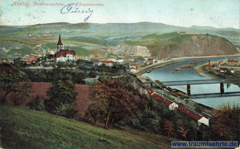 – Details – Year: ca. 1905 Postal state: postally used 1908 Inscription front: Aussig, Ferdinandshöhe, mit Elbepanorama. Inscription back: Alois Weidlich, vormals Franz Hübl's Nchf., Aussig. Postmark(s): Aussig 2, * […], –2.X.08 XII– Please note:
