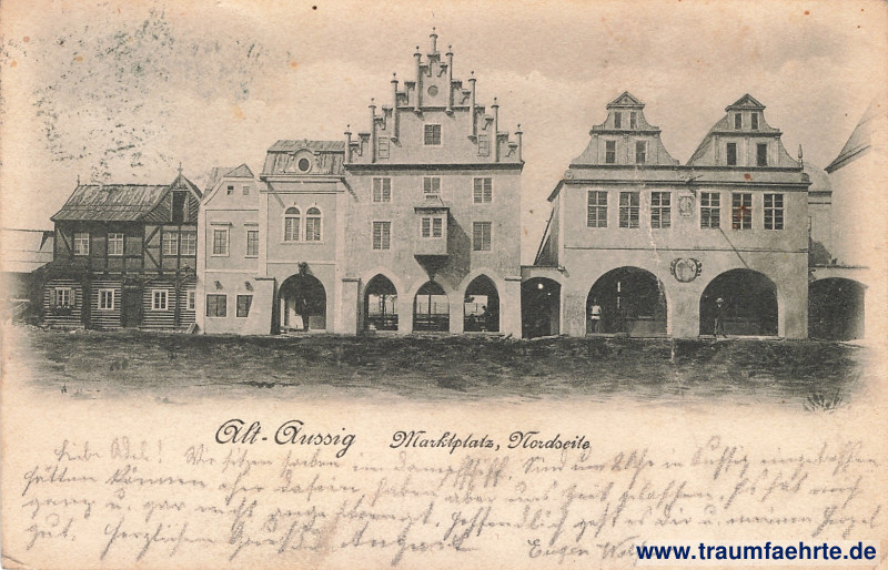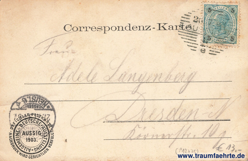 – Details – Year: 1903 Postal state: postally used 1903 Inscription front: Alt-Aussig, Marktplatz, Nordseite Inscription back: Correspondenz-Karte, Aussig 1903. Allgemeine - Deutsche - Ausstellung, Officielle Postkarte, Nachdruck wird gerichtlich verfolgt. Postmark(s): Aussig 2, e, 26.7.[03…]; Dresden-Neust. 6, Ü [b], 27.7.03 4–5V. Please note: