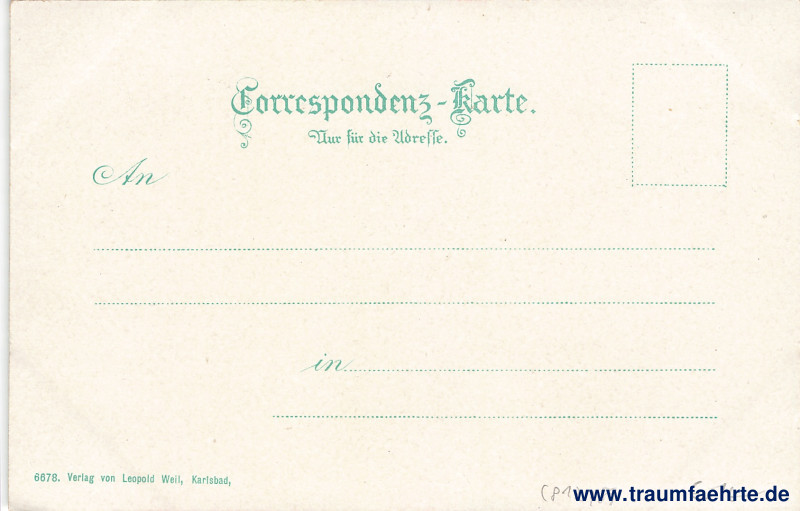 – Details – Jahr: ca. 1895 Status: ungelaufen Beschriftung vorne: Karlsbad, Café Kaiserpark. Beschriftung hinten: Correspondenz-Karte. Nur für die Adresse. An … in … 6678. Verlag von Leopold Weil, Karlsbad, Stempel: keine Hinweis: