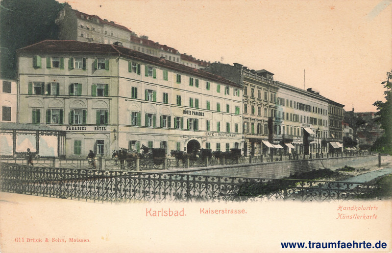 Inscription front: Karlsbad. Kaiserstrasse. 611 Brück & Sohn, Meissen. Handkolorierte Künstlerkarte. Hôtel Paradies, Paradies Hôtel, Café & Restaurant.