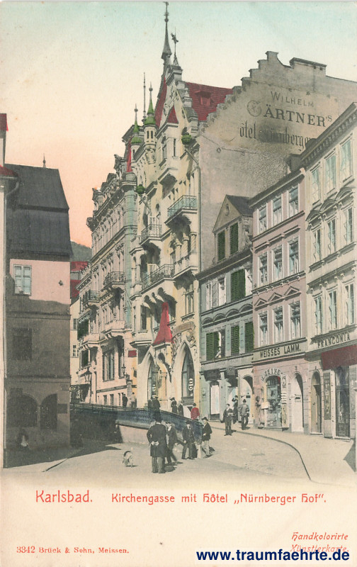 Inscription front: Karlsbad. Kirchengasse mit Hôtel „Nürnberger Hof“. 3342 Brück & Sohn, Meissen. Handkolorierte Künstlerkarte. Wilhelm Gärtner's Hôtel Nürnberge[r Hof], Weisses Lamm. Franconia, […]