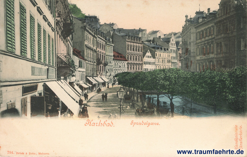 Beschriftung vorne: Karlsbad. Sprudelgasse. 794. Brück & Sohn, Meissen. Handkolorierte Künstlerkarte.