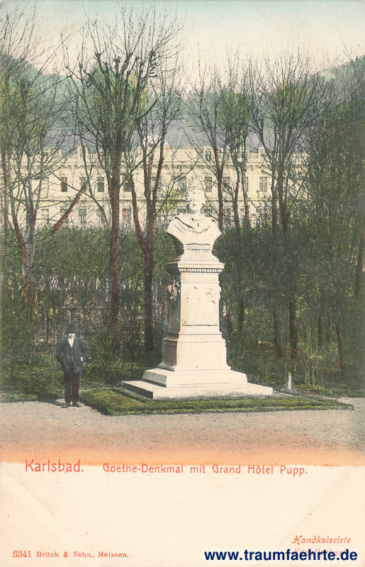 Beschriftung vorne: Karlsbad. Goethe-Denkmal mit Grand Hôtel Pupp. 3341 Brück & Sohn, Meissen. Handkolorierte Künstlerkarte.