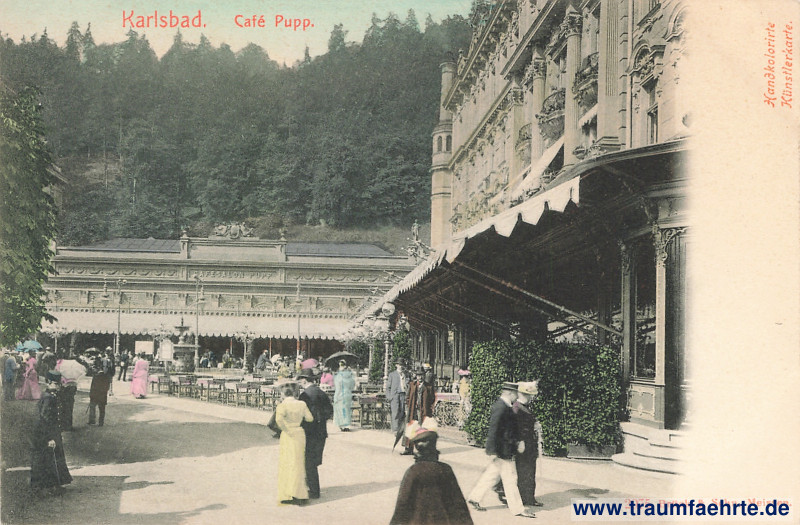Beschriftung vorne: Kalrsbad. Café Pupp. 2076 Brück & Sohn, Meissen. Handkolorierte Künstlerkarte. Cafesalon Pupp