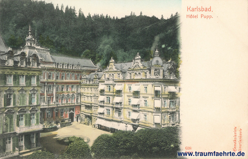 Beschriftung vorne: Karlsbad. Hôtel Pupp. 638 Brück & Sohn, Meissen. Handkolorierte Künstlerkarte