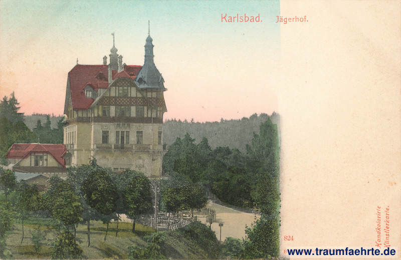 Inscription front: Karlsbad. Jägerhof. 824 Brück & Sohn, Meissen. Handkolorierte Künstlerkarte.