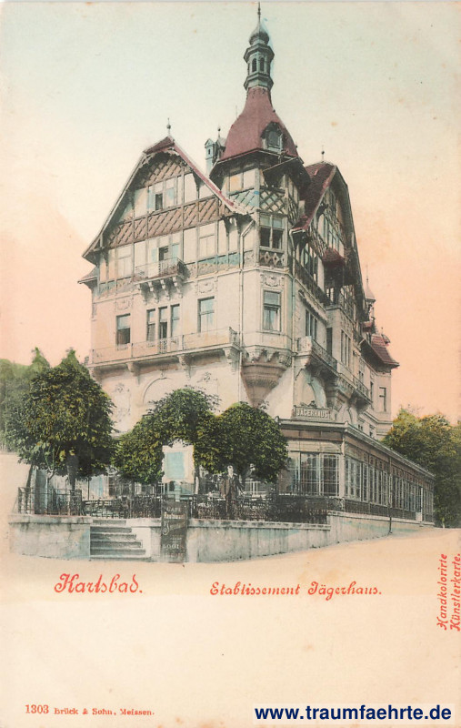 Inscription front: Karlsbad. Establissement Jägerhaus. 1303 Brück & Sohn, Meissen. Handkolorierte Künstlerkarte.