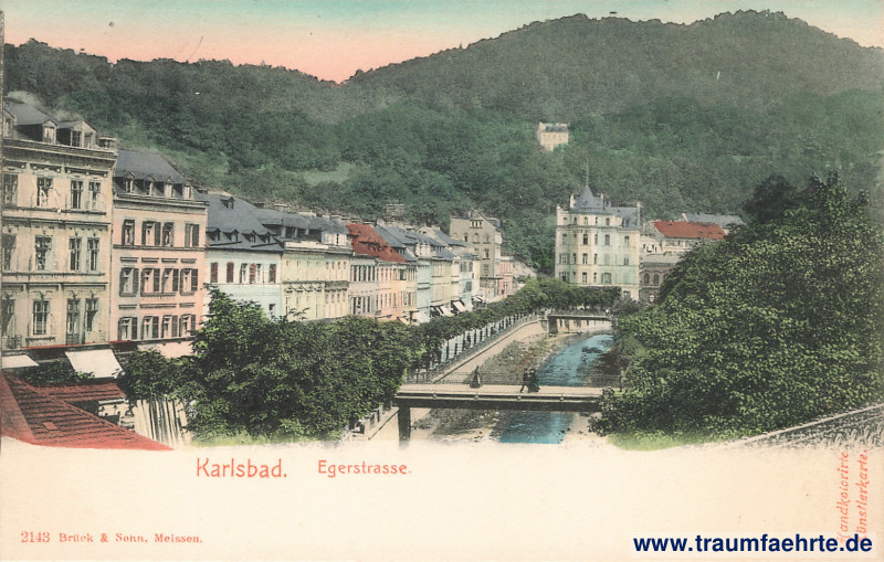 Inscription front: Karlsbad. Egerstrasse. 2143 Brück & Sohn, Meissen. Handkolorierte Künstlerkarte.