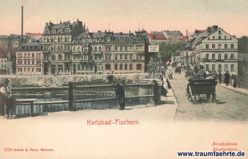 Beschriftung vorne: Karlsbad-Fischern. 2723 Brück & Sohn, Meissen. Handkolorierte Künstlerkarte.