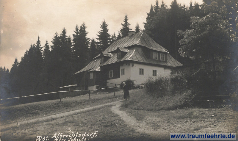 Ansichtskarte Alte Schule in Albrechtsdorf / Albrechtice v Jizerských horách [ Permalink ]Schlagworte: Schulen, Holz, Geländer, Treppen, Frauen, Wald, Böhmen, Sudetenland