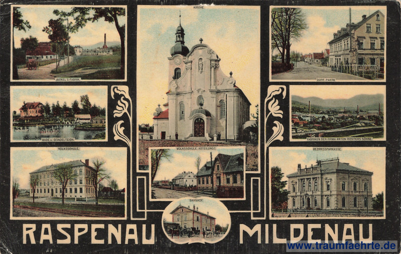 Beschriftung vorne: Raspenau, Mildenau, Jäckel's Fabrik. Kirche. Dorf - Partie. Bade u. Gondelteich. Fabriken der Firma Anton Richters Söhne. Volksschule. Volksschule Abteilung I. Bezirkssparkasse. Bahnhof.