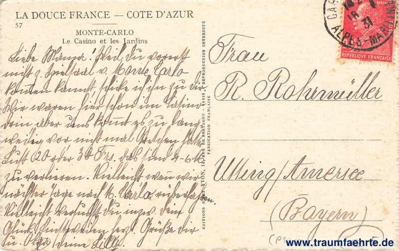 – Details – Year: ca. 1930 Postal state: postally used 1931 Inscription front: Yvon Inscription back: La Douce France – Cote d'Azur, 57, Monte-Carlo, Le Casino et les Jadins, Editions d'art Yvon, 14, Rue de Bretagne – Paris, Reproduction interdite, Fabrication française Postmark(s): […], Alpes-Maritime, 14 2 31, 18[…] Please note: