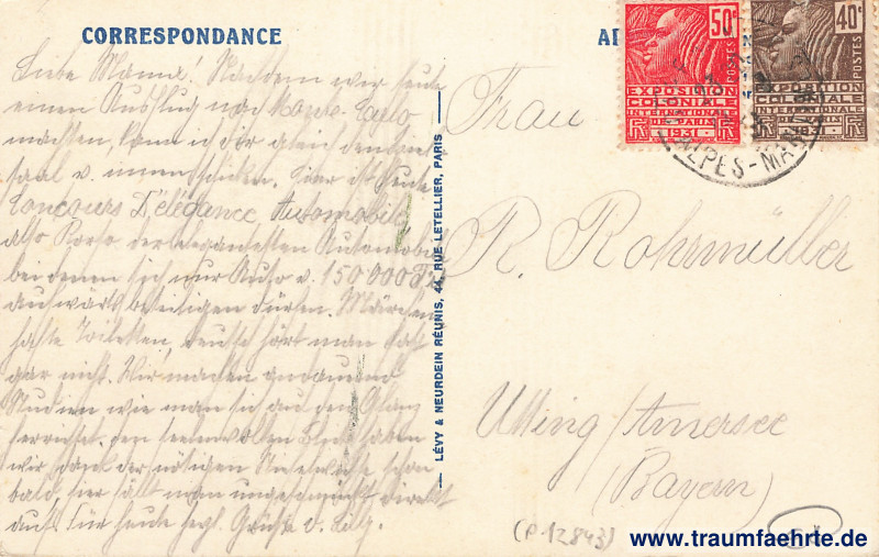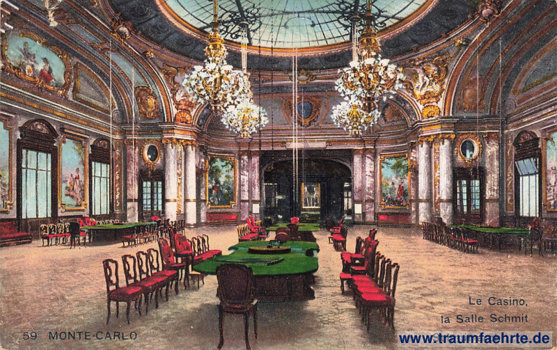 – Details – Year: ca. 1930 Postal state: postally used 193? Inscription front: 59 Monte-Carlo, Le Casino, la Salle Schmit (Schmit arch.) LL Inscription back: Correspondance, Ad[resse], Lévy & Neurdein Réunis, 44, Rue Lettlier, Paris Postmark(s): […], Alpes-Maritime, […] Please note: