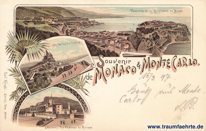 – Details – Jahr: ca. 1900 Status: ungelaufen Beschriftung vorne: Souvenir de Monaco & Monte Carlo. Panorama de la Principauté de Monaco. Monte Carlo Casino. Monaco. Le Château du Prince, Carl Könzli, Zürich. Dep. No. 441. Beschriftung hinten: Carte postale, Ce côte est exclusivement réservé à l'adresse, M …, Affranchir 0,10 c Stempel: keine Hinweis: