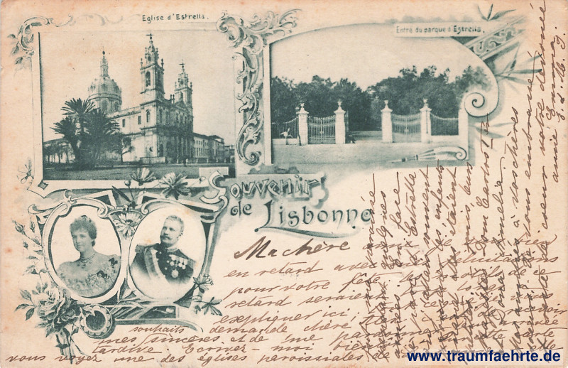 gräuliche Schwarzweißfotografie mit vier Ansichten – 1.) Kirche mit Kuppel und Türmen, davor Palmen, Mauer und Passant, 2.) Park mit Zaun und Bäumen, 3.) Portraitfoto der portugiesischen Königin Amélie d’Orléans, 4.) Portraitfoto des portugiesischen Königs Karl I