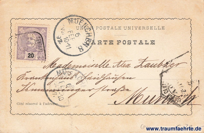Stempel: Lisboa Central […]; Lisboa Central, A […], 2-2-97 […]; Muenchen 8, 6 Feb 97, Vor. 9–10; Muenchen […], 6 Feb 97, Vor. 10–11