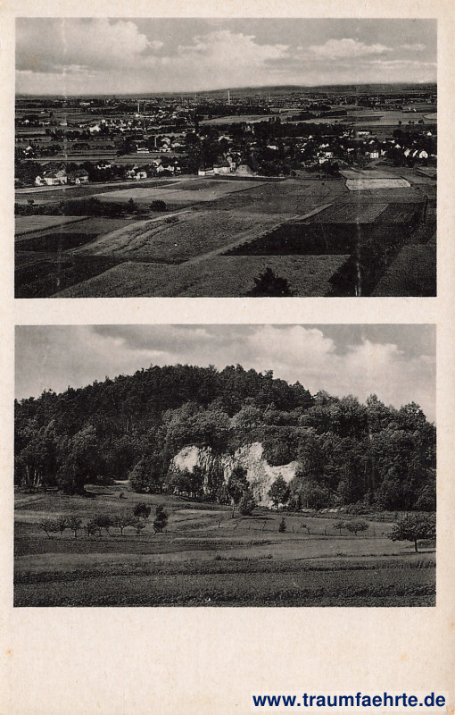 monochrome photograph with two views – 1st) panorama of Hörnitz with fields and chimneys, 2nd) Koitsche hill with meadows, rocks, and forest