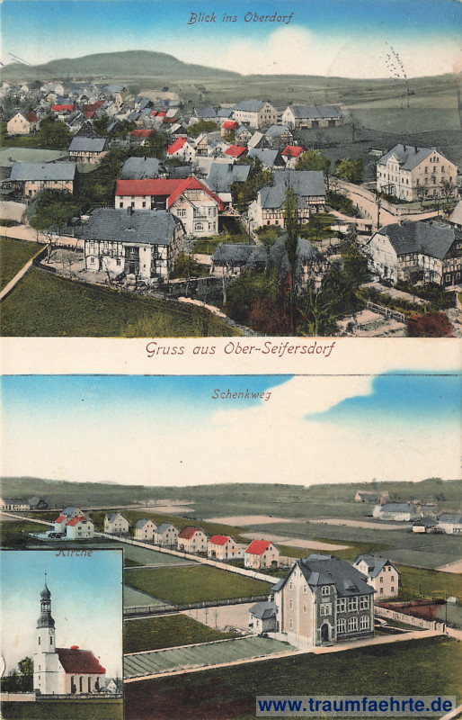 farbig mit drei Ansichten – 1.) Panorama von Oberseifersdorf mit Häusern, Straßen, Zäunen, Bäumen und Strommast, Hügel und Felder im Hintergrund, 2.) Schenkweg (heutige Landstraße) mit Häusern, umgeben von Feldern und Zäunen, 3.) Kirche mit Kirchturm, Wiese, Mauer und Bäumen