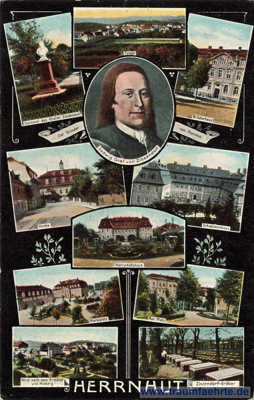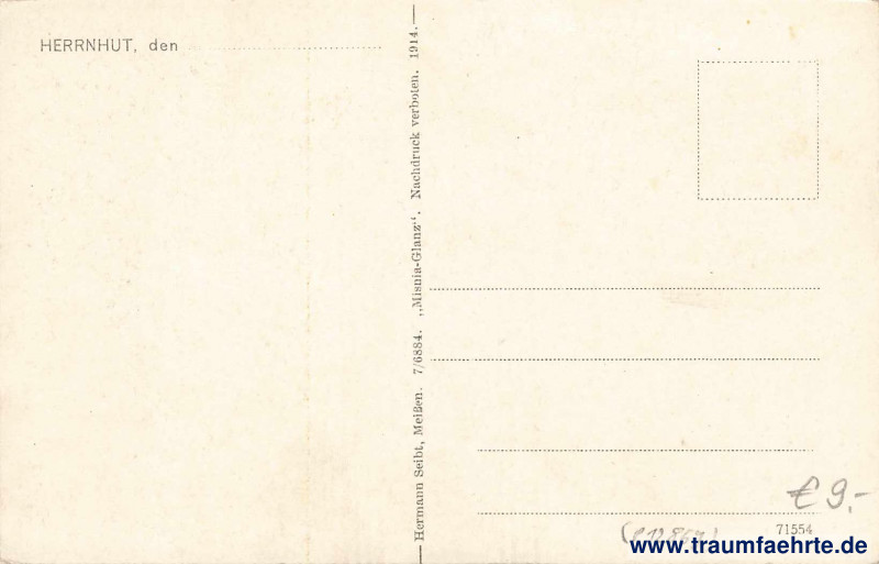 – Details – Year: 1914 Postal state: postally unused Inscription front: Herrnhut, Ludwig Graf von Zinzendorf, Der Gründer von Herrnhut, Denkmal des Grafen Zinzendorf, Totale, Brüderhaus, Kirche, Schwesternhaus, Herrschaftshaus, Marktplatz, Am Platz, Blick nach dem Friedhof und Hutberg, Zinzendorf-Gräber Inscription back: Herrnhut, den ..., Hermann Seibt, Meissen. 7/6884. „Misnia-Glanz“. Nachdruck verboten. 1914. 71554 Postmark(s): none Please note: