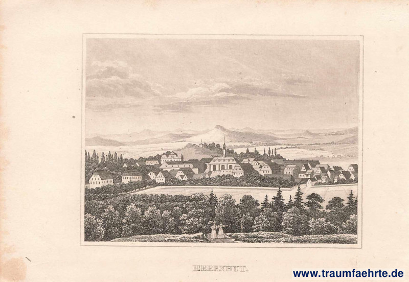 Lithographie – Original-Lithographie in ungefährem Postkartenformat von Herrnhut mit Kirche und Kirchturm, Frauen im Vordergrund, Hügel im Hintergrund