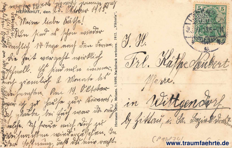 – Details – Year: 1912 Postal state: postally used 1913 Inscription front: Herrnhut. Kirche. Inscription back: Herrnhut, den …, Hermann Seibt, Meissen. 1/6890. Nachdruck verboten. 1912. „Viktoria“. Postmark(s): Herrnhut, * e […], 2[5].10.13. 6–7N Please note: