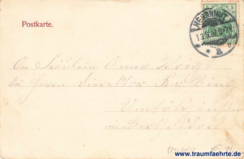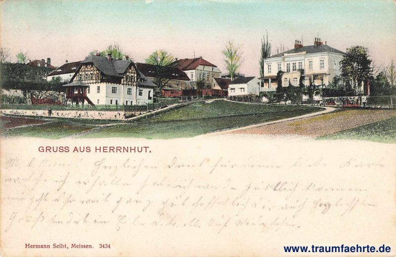 – Details – Year: ca. 1905 Postal state: postally used 1907 Inscription front: Gruss aus Herrnhut. Hermann Seibt, Meissen. 3434 Inscription back: Postkarte. Postmark(s): Herrnhut, * a *, 1[9].9.07. 6–7V. Please note: