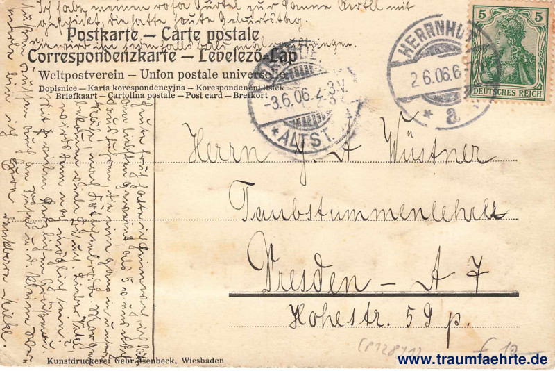 – Details – Year: ca. 1905 Postal state: postally used 1906 Inscription front: Herrnhut i. Sa., Schwesternhaus, Verlag Ph. Verbeek Inscription back: Postkarte – Carte postale, Correspondenzkarte – Levelezö-Lap, Weltpostverein – Union postale universelle, Dopisnice – Karta koresondencyjna – Korespondenčni listek, Briefkaart – Cartolina postale – Post card – Brefkort, Kunstdruckerei Gebr. Isenbeck, Wiesbaden Postmark(s): Herrnhut, * a […], 2.6.06 –7N; Dresden-Altst. […], * […], –3.6.06. 2–3V. Please note: