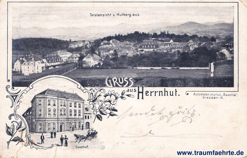 Inscription front: Gruss aus Herrnhut. Totalansicht v. Hutberg aus, Gasthof. Automaten-Institut „Saxonia“. Dresden-N.