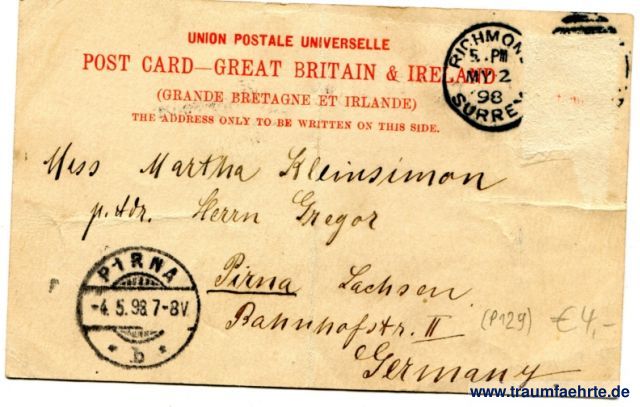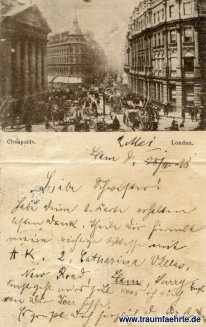 – Details – Jahr: ca. 1895 Status: gelaufen 1898, Briefmarke entfernt Beschriftung vorne: Cheapside. London. Beschriftung hinten: Union Postale Universelle, Post Card – Great Britain & Ireland, (Grande Bretagne et Irlande), The address only to be written on this side. Stempel: 2x Richmond, Surrey, 5. Pm MY 2 98; Pirna, b, -4.5.98.7-8V. Hinweis: