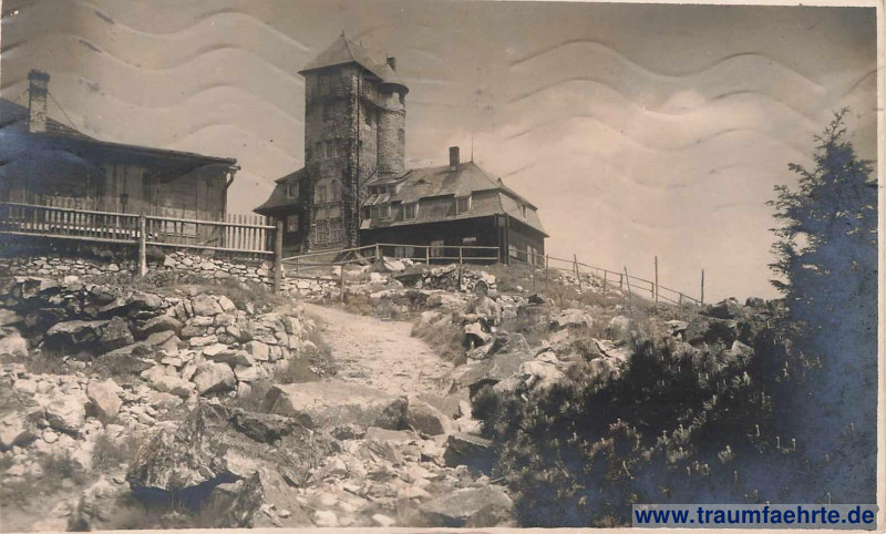 Schlagworte: Türme, Aussichtstürme, Bauden, Berghütten, Bäche, Steine, Zäune, Jeschkengebirge, Sudetenland, Gebirge