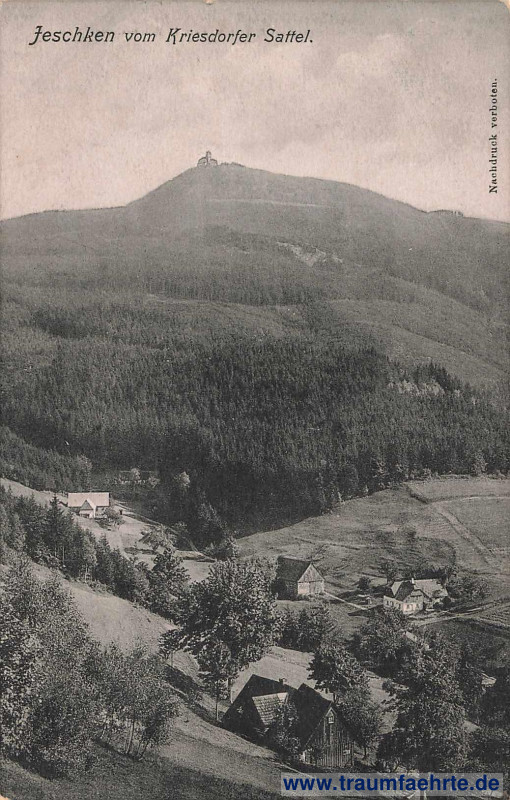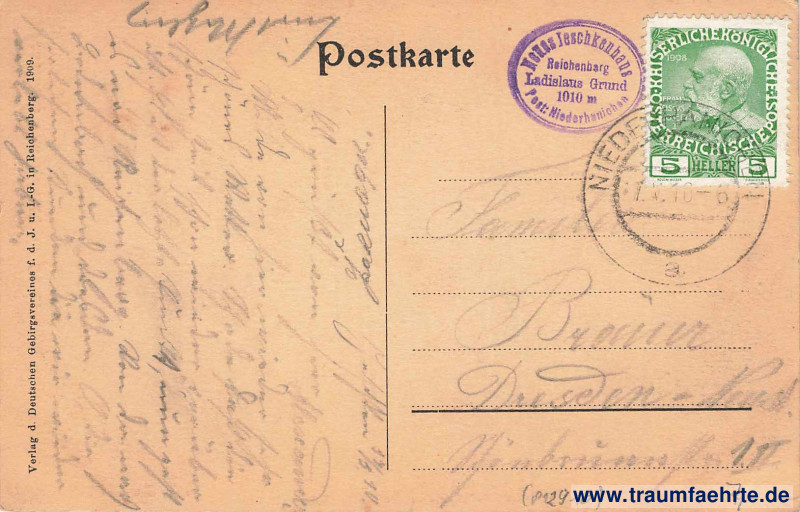 – Details – Jahr: 1909 Status: gelaufen 1910 Beschriftung vorne: Jeschken vom Kriesdorfer Sattel. Nachdruck verboten. Beschriftung hinten: Postkarte, Verlag d. Deutschen Gebirgsvereins f. d. J. u. I.-G. in Reichenberg. 1909. Stempel: Neues Jeschkenhaus, Reichenberg, Ladislaus Grund, 1010 m, Post: Niederhanichen; Niederhanichen, a, 17.V.10 – 6 Hinweis: