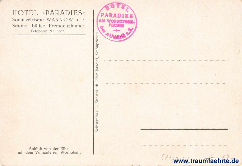 – Details – Year: ca. 1940 Postal state: postally unused Inscription front: Hotel „Ráj“ „Paradies“ Inscription back: Hotel »Paradies«, Sommerfrische Wannow a. E., Schöne, billige Fremdenzimmer. Telephon Nr. 3353. Anblick von der Elbe mit dem Vulkanfelsen Workotsch. Selbstverlag. – Kunstdruck: Max Jarschel, Schönpriesen. Postmark(s): Hotel Paradies am Workotschfelsen bei Aussig a. E. Please note: