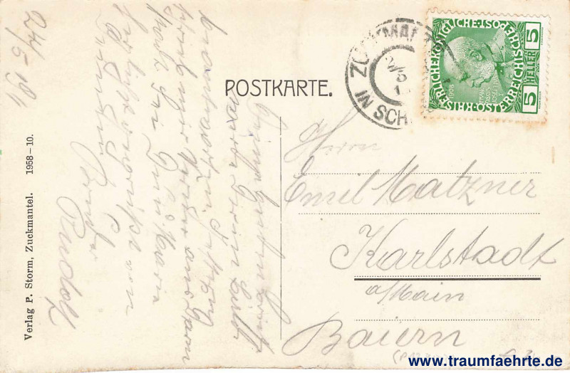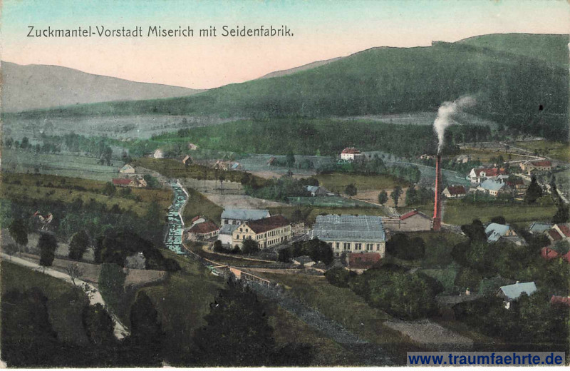 – Details – Jahr: ca. 1910 Status: gelaufen 1911 Beschriftung vorne: Zuckmantel-Vorstadt Miserich mit Seidenfabrik. Beschriftung hinten: Postkarte. Verlag: P. Storm, Zuckmantel. 1958–10 Stempel: Zuckmantel in Schlesien, 2[…] 5 1[1] Hinweis: