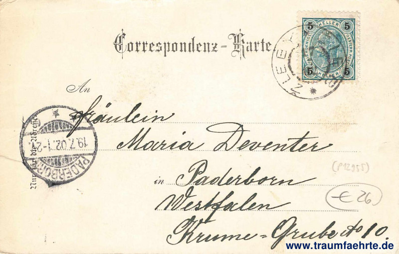– Details – Jahr: ca. 1900 Status: gelaufen 1902 Beschriftung vorne: Žleb, den … Lichtdruck von J. Löwy, Wien. Beschriftung hinten: Correspondenz-Karte. Nur für die Adresse. Stempel: Žleby * Žleb, 17 7 02; Paderborn, 19.7.92. 1–2V. Hinweis: