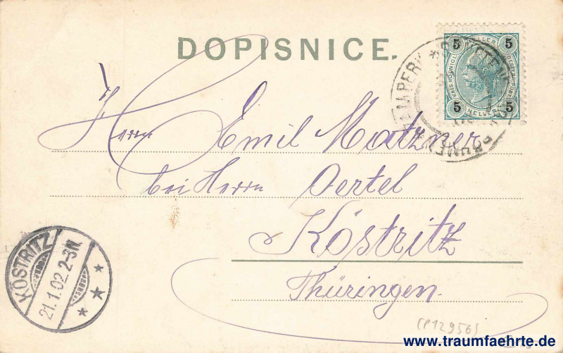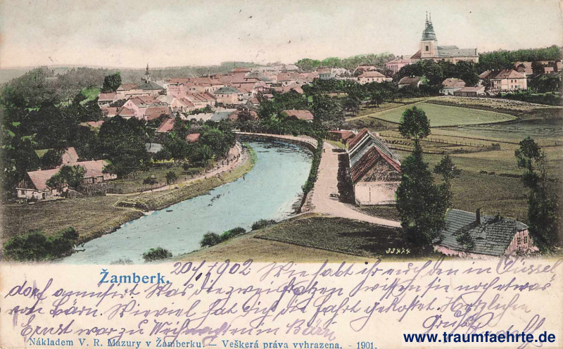 – Details – Jahr: 1901 Status: gelaufen 1902 Beschriftung vorne: Žamberk. Nákladem V. R. Mazury v Žamberku. – Veškerá práva vyhrazena. – 1901. 33474 Beschriftung hinten: Dopisnice Stempel: Žamberk […] Böhmen, […9; Köstritz, ***, 21.1.02 2–3N. Hinweis: