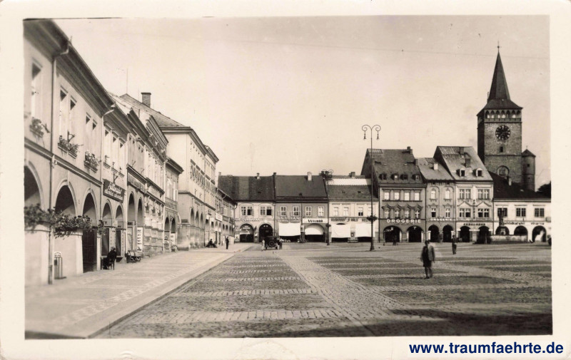 Schlagworte: Plätze, Tore, Türme, Drogerien, Torbögen, Laternen, Uhren, Böhmen, Zweiter Weltkrieg, Oldtimer