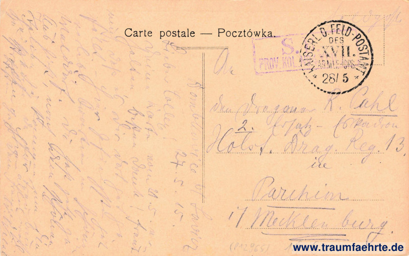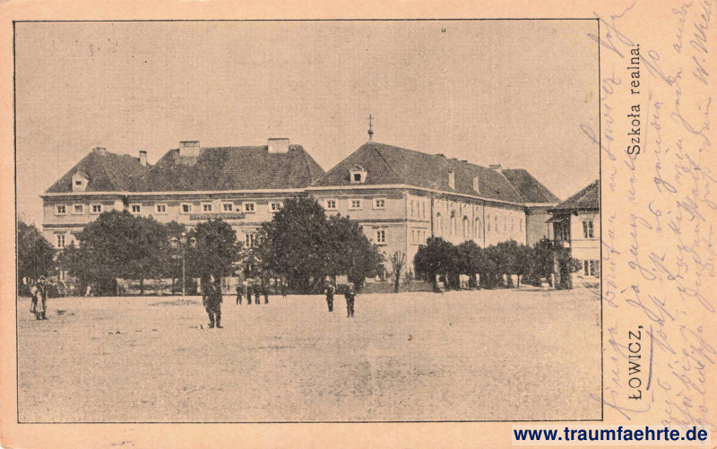 – Details – Jahr: ca. 1910 Status: gelaufen ohne Briefmarke (Feldpost), 1915 Beschriftung vorne: Łowicz, Szkoła realna. Beschriftung hinten: Carte postale – Pocztówka. Stempel: Kaiserl. D. Feld-Postamt des XVII. Armee-Cps., 28/ 5; S. B. Prov. Kol. [No. 4 XVII…] Hinweis:
