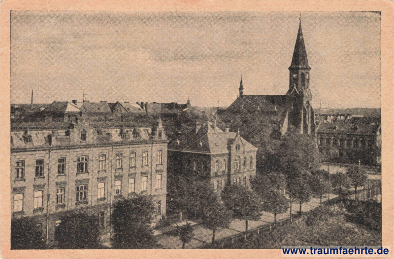Schwarzweißfotografie – Allee mit Zäunen, Herz-Jesu-Kirche (Kostel Božského Srdce Páně) mit Kirchturm, Villa (heutige römisch-katholische Kirche) und Westseite des Rathauses im Hintergrund