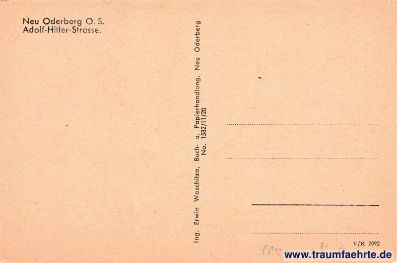 Beschriftung hinten: Neu Oderberg O. S. Adolf-Hitler-Strasse. Ing. Erwin Waschitza, Buch- u. Papierhandlung, Neu Oderberg, No. 1582/11/20, V/K 2092