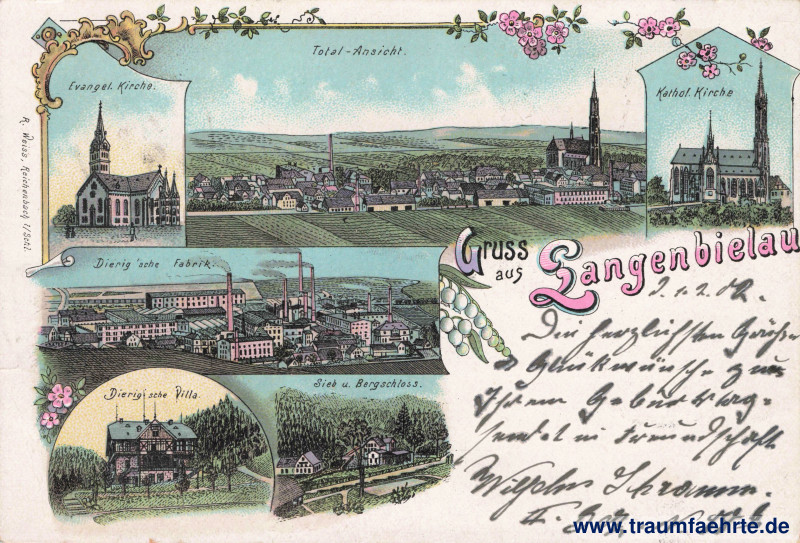 Beschriftung vorne: Gruss aus Langenbielau, Evangel. Kirche. Total-Ansicht. Kathol. Kirche. Dierig'sche Fabrik. Dierig'sche Villa. Sieb u. Bergschloss. R. Weiss, Reichenbach i/Schl.