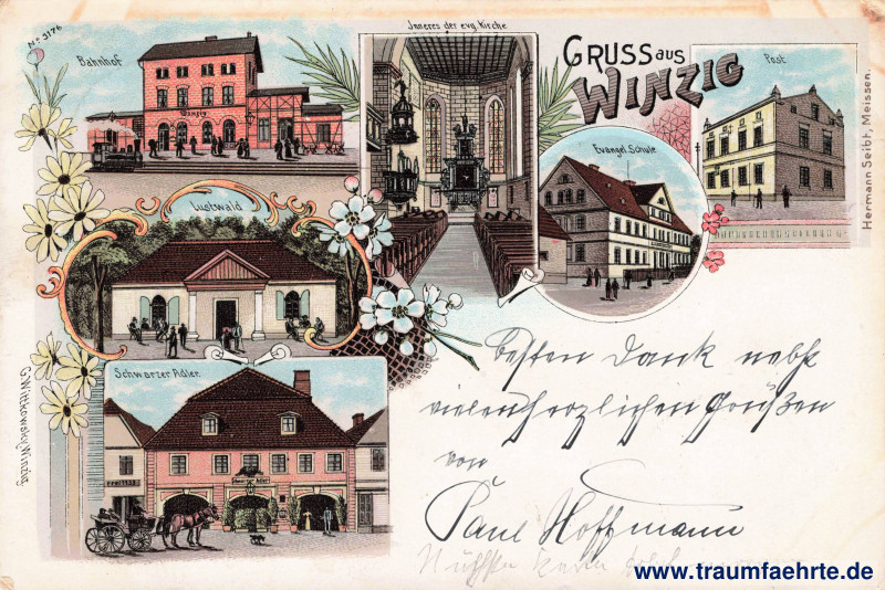 Beschriftung vorne: No. 3176, Gruss aus Winzig, Bahnhof, Inneres der evg. Kirche, Evangel. Schule, Post, Lustwald, Schwarzer Adler. C. Wittkowsky, Winzig.