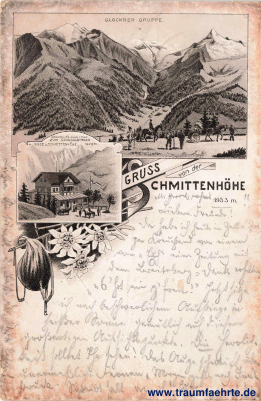 Beschriftung vorne: Gruss von der Schmittenhöhe, 1953 m. Glockner Gruppe. Brunner's Gasthof zum Grossglockner A.-Wege z. Schmittenhöhe. 1573 m.