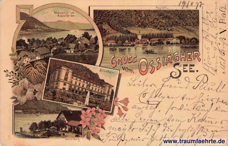farbige Lithographie mit vier Ansichten – 1.) Panorama von Steindorf mit Häusern, dampfendem Schornstein und See, Berge im Hintergrund, 2.) Panorama von Ossiach mit Kirche und Kirchturm, davor See mit Boot, im Hintergrund Berg und Wald, 3.) Annenheim, davor Springbrunnen, dahinter Berg mit Wald, 4.) Haus in Saltendorf mit Platz, Passanten und Allee, See mit Segelbooten und Dampfschiff, Kirche, Berg und Wald im Hintergrund; dekoriert mit Blumen