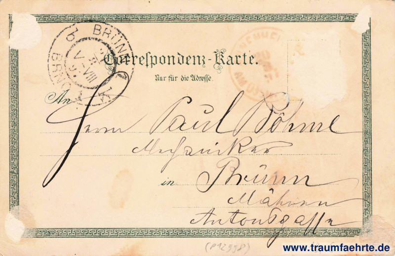 Stempel: [Annenheim] am Ossiac[her See], 20 8 97; Brünn, Brno, 21 8 97, V–VIII