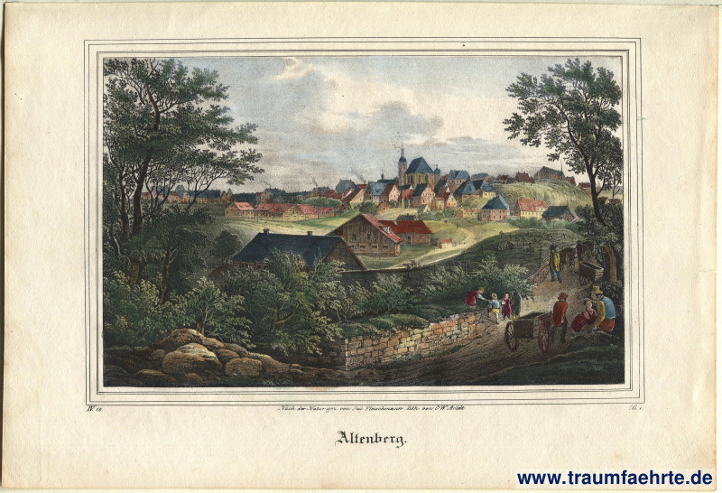Original: kolorierte Lithographie – Panorama von Altenberg mit Kirche, Friedhof mit Mauer und Passanten (teilweise) mit Handkarren im Vordergrund